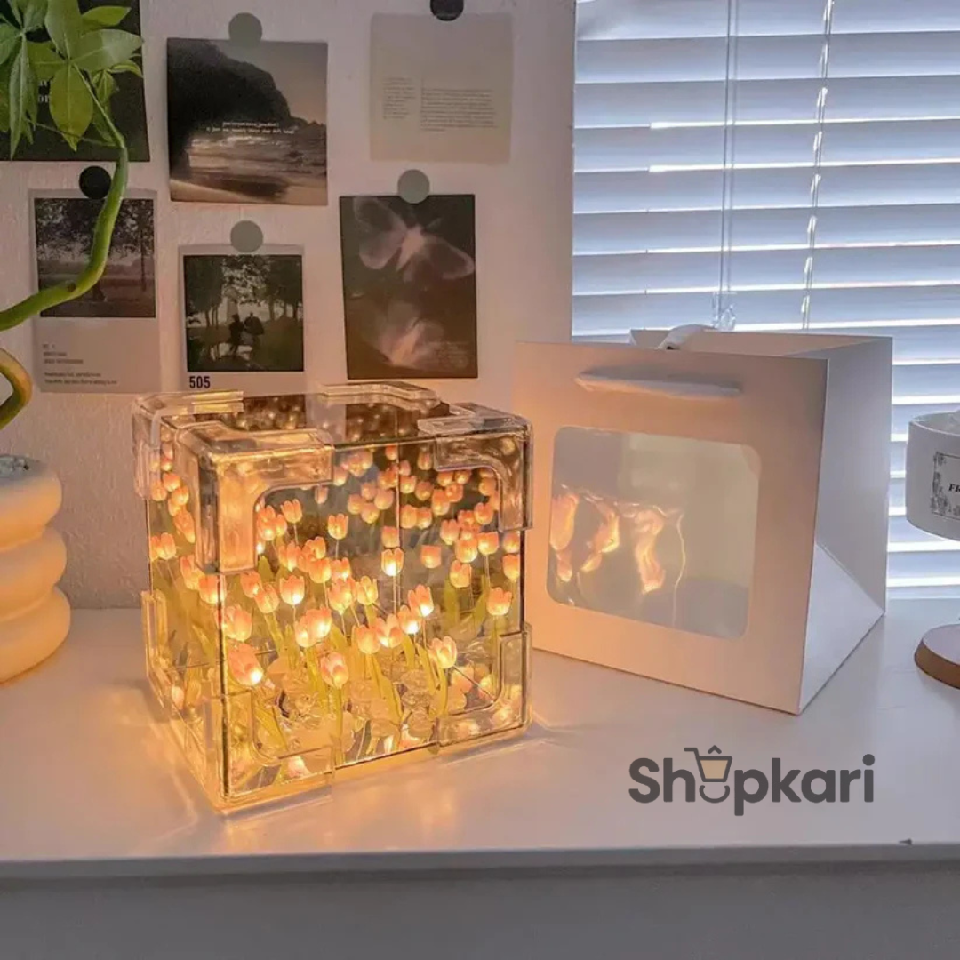 Enciéndela y observa como 20 tulipanes iluminados se multiplican en un espectáculo de espejos, creando la ilusión de un jardín sin fin .